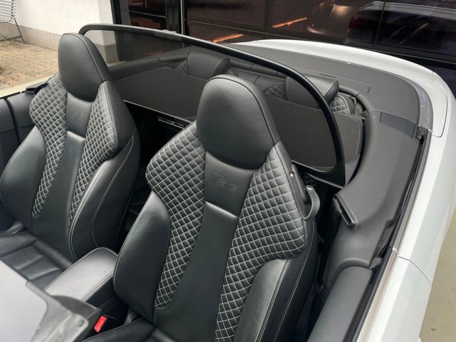 Sonderausstattung:Akustik-Verdeck, Außenspiegel elektr. verstell- und heizbar, beide, Fahrassistenz-System: Parklenkassistent mit selektiver Anzeige, Fahrwerk mit Dämpferregelung (Magnetic Ride), Glanz-Paket, Innenausstattung: Dekoreinlagen 3D-Optik schwarz, Innenausstattung: Leder Feinnappa, Lendenwirbelstützen vorn, elektr. verstellbar, Lenkrad (Sport/Leder - 3-Speichen, unten abgeflacht) mit Multifunktion und Schaltfunktion, Licht-Paket, LM-Felgen 8x19 (5-Doppelspeichen, Stern-Design, kontrastgrau, teilpoliert), Metallic-Lackierung, Multi-Media-Interface MMI Navigation Plus mit MMI Touch, S Sportsitze vorn, Satz Adapterkabel plus Audi music interface, Sitzheizung vorn, Sound-System Bang & Olufsen, Windschott, Xenon-Scheinwerfer Plus adaptive light (Abbiegelicht integriert)