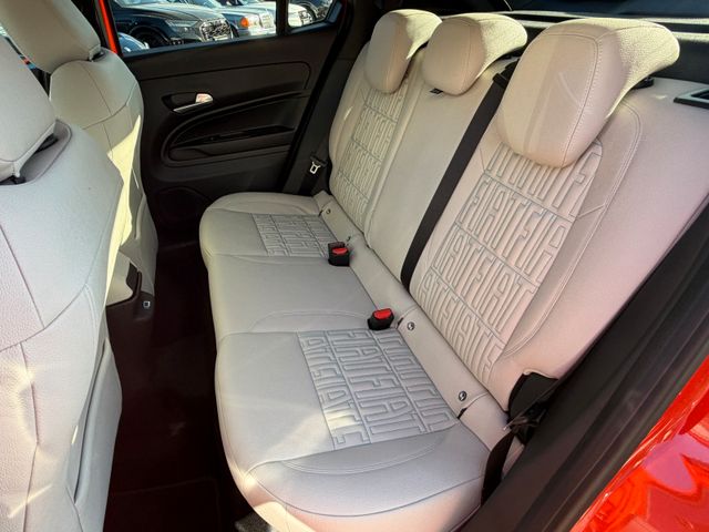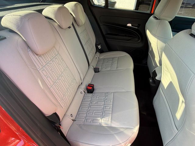Weitere Ausstattung:6 Lautsprecher, Ablagetasche an Vordersitzlehnen, Adaptive Geschwindigkeitsregelanlage (ACC), Airbag Beifahrerseite, Airbag Fahrerseite, Ambiente-Beleuchtung, Antriebs-Schlupfregelung (ASR), Außenspiegel elektr. verstell- und heizbar, beide, Außenspiegel mit Abdeckkappen schwarz, Dachhimmel mit LED-Beleuchtung, Elektromotor 115 kW (cont. 62 kW), Exterieurumfänge Chrom, Fahrassistenz-System: Aufmerksamkeits-Assistent, Fahrassistenz-System: Autonomer Notbrems-Assistent (AEB), Fahrassistenz-System: Bremsassistent, Fahrassistenz-System: Fernlichtassistent, Fahrassistenz-System: Spurhalteassistent, Fahrassistenz-System: Stauassistent, Fahrassistenz-System: Totwinkel-Assistent, Fahrassistenz-System: Verkehrszeichenerkennung, Fahrmodusschalter, Fensterheber elektr. vorn mit Komfortschaltung, Fußmatten, Fußmatten Velours, Gepäck-/Laderaumabdeckung höhenverstellbar, Geschwindigkeits-Regelanlage (Tempomat) mit Abstandsregelung, Heckklappe/-Deckel elektr. betätigt (öffnen + schliessen, sensorgesteuert), Heckklappenöffnung elektrisch, Heckleuchten LED, HV-Batterie 54 kWh (Lithium-Ionen), Induktionsladeschale für Smartphone (Wireless Charging), Infotainment-System: UConnect 5 mit Navigationssystem, DAB+ und Bluetooth-Freisprecheinrichtung (Touchscreen 10,25"), Innenausstattung: Dekoreinlagen Armaturenbrett, weiß, Innenspiegel mit Abblendautomatik, Instrumentenanzeige Farbdisplay, 7 Zoll, Karosserie: 5-türig, Keyless-Entry (Passive Entry), Klimaautomatik, Kopf-Airbag-System vorn und hinten, Kopfstütze hinten mitte, Kopfstützen hinten, Ladeanschluss 11 kW, Ladekabel mit Typ 2-Stecker (Mode 3), Lenkrad (Soft Touch) mit Multifunktion, Lenksäule (Lenkrad) höhenverstellbar, LM-Felgen, Metallic-Lackierung, Mittelarmlehne vorn, Mittelkonsole, Blende vorn (La Prima), Nebelscheinwerfer LED, Notrufsystem (eCall), One Pedal Drive (elektronisches Gaspedal), Parkbremse elektrisch, Radstand 2562 mm, Rückfahrkamera mit 360° Surround View, Rückfahrkamera Park View, Rücksitzbank klappbar, Scheibenwischer beheizbar, Scheinwerfer LED, Schnellladefunktion 100 kW, Seitenairbag vorn, Sitz vorn links elektr. verstellbar, Sitz vorn links mit Massagefunktion, Sitz vorn links verstellbar (6-fach), Sitz vorn rechts verstellbar (6-fach), Sitzbezug / Polsterung: Kunstleder, Sitze vorn mit Massagefunktion, Sitzheizung vorn links, Smartphone Schnittstelle (Apple CarPlay & Android Auto), Sondermodell La Prima, Sonnenblenden mit Spiegel (beleuchtet), Steckdose (12V-Anschluß) vorn, Tagfahrlicht LED, Türgriffe innen verchromt, USB-Anschluss für den Fondbereich, USB-Anschlüsse (Typ C und Typ A), Verglasung getönt, Warnanlage für Sicherheitsgurte vorn und hinten, Wärmepumpe zur Reichweitenoptimierung